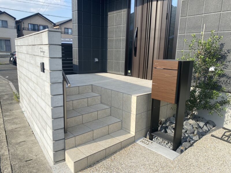 シンプルながらも存在感のあるデザインで、機能性とデザイン性を兼ね備えたモダン外構が完成しました。