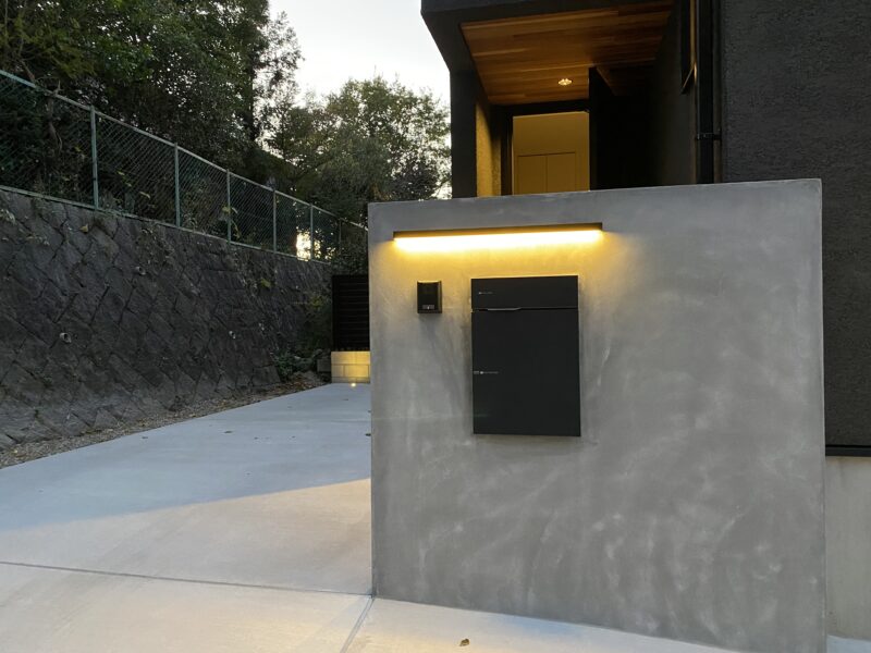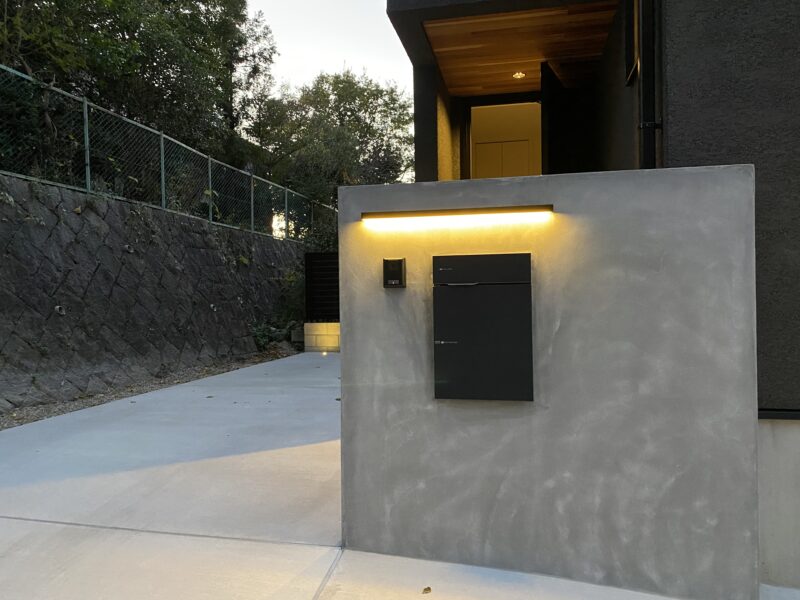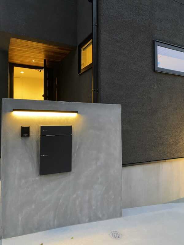 アクセントは夜のライティング。門塀にバーライトを仕込み、宅配ボックスと表札をやさしく照らします。